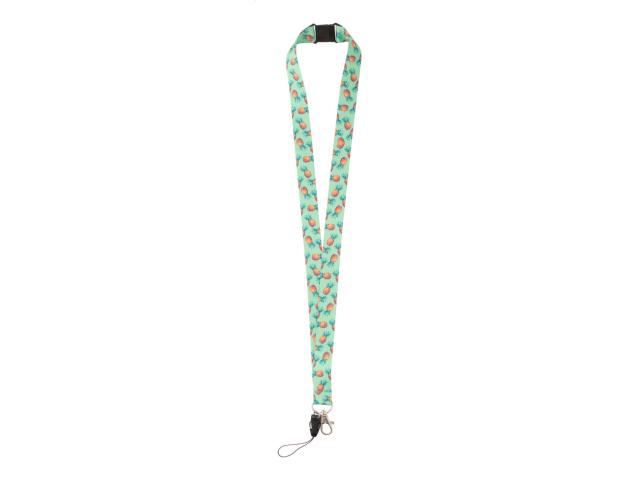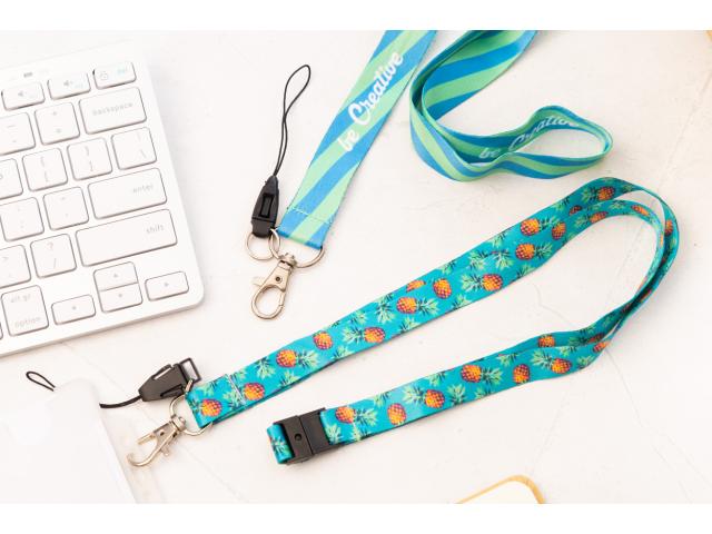 Custom made, polyester lanyard with metal carabiner, mobile string and safety buckle. With sublimation printed graphics on both sides. MOQ: 100 pcs.