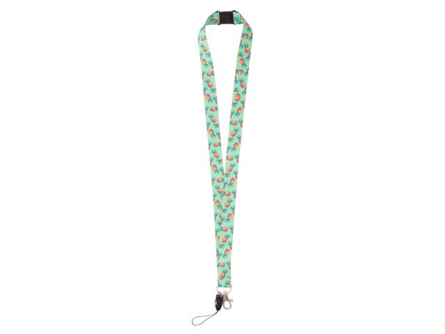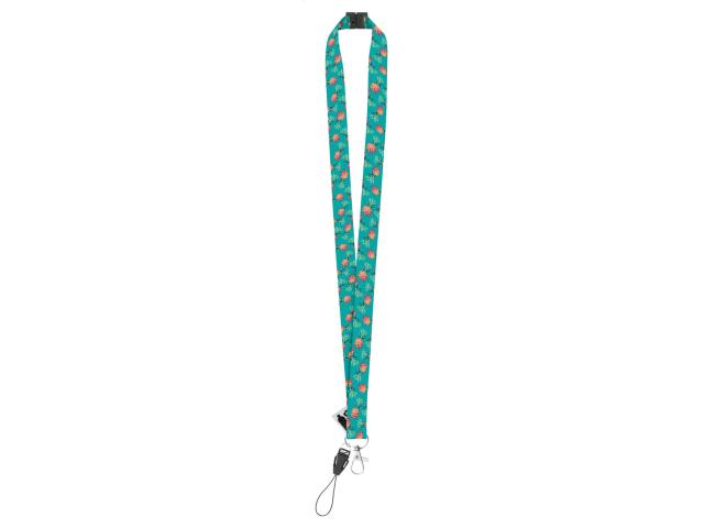Custom made, RPET lanyard with metal carabiner, mobile string and safety buckle. With sublimation printed graphics on both sides. MOQ: 100 pcs.