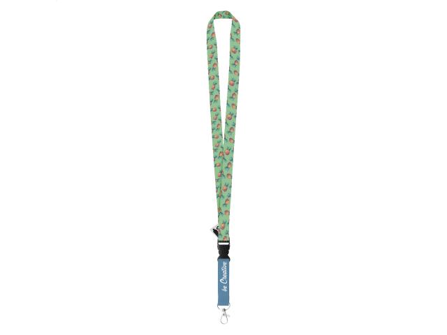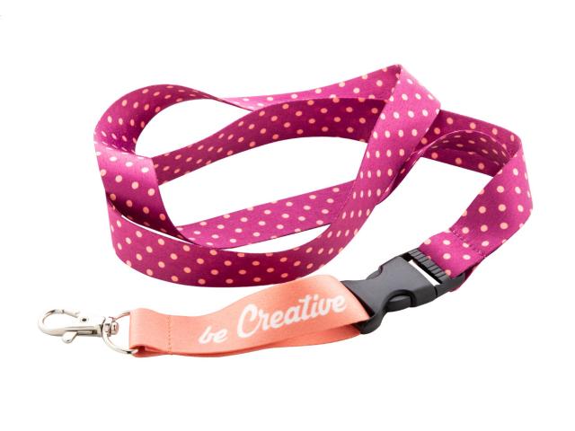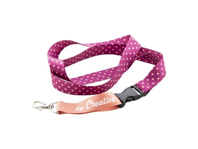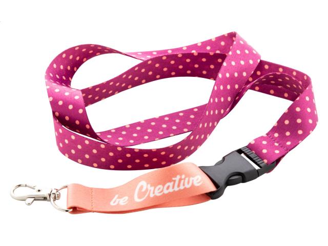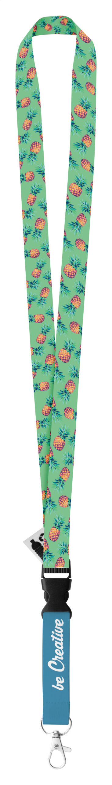 Custom made, RPET lanyard with detachable metal carabiner. With sublimation printed graphics on both sides. MOQ: 100 pcs.