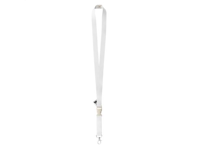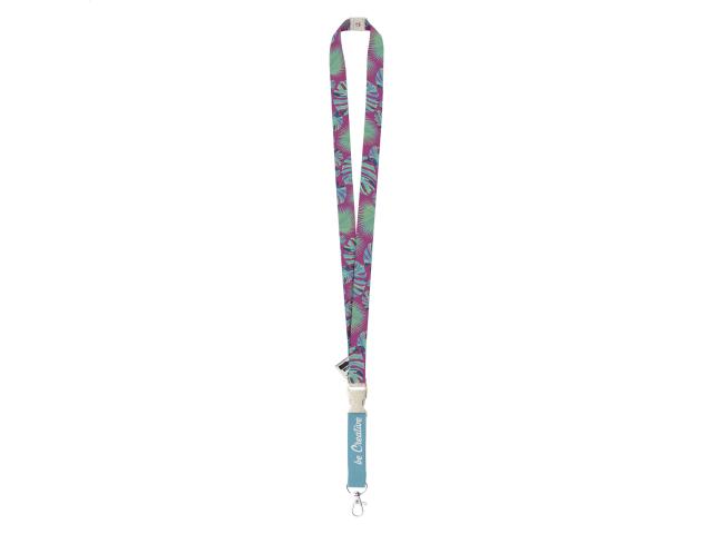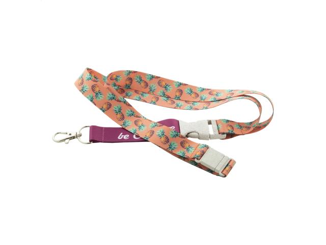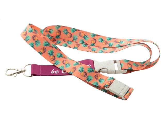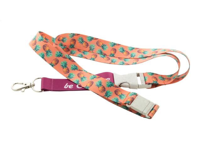 Custom made, RPET lanyard with detachable metal carabiner and wheat straw plastic safety buckle. With sublimation printed graphics on both sides. MOQ: 100 pcs.