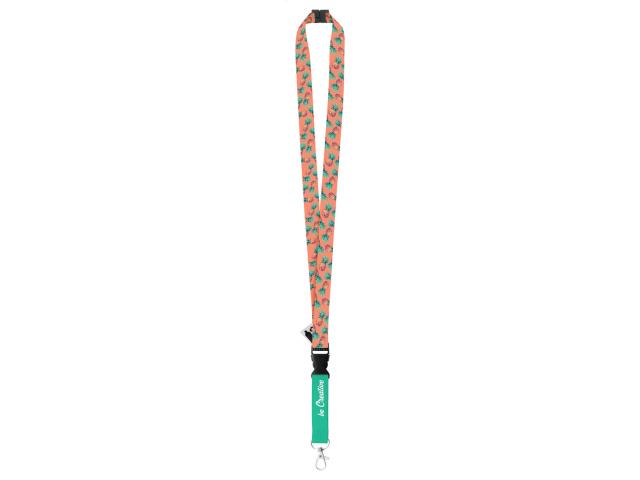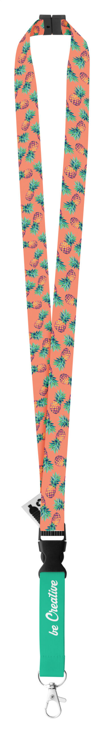 Custom made, RPET lanyard with detachable metal carabiner and safety buckle. With sublimation printed graphics on both sides. MOQ: 100 pcs.