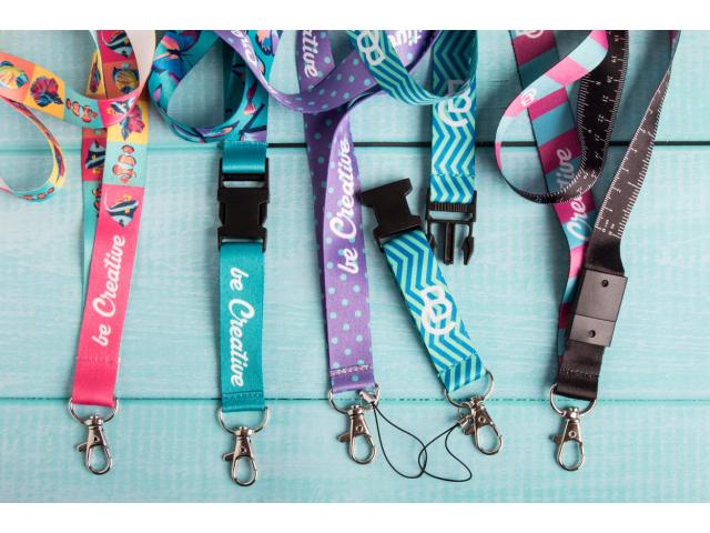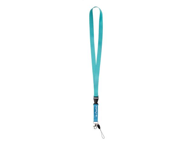 Custom made, polyester lanyard with detachable metal carabiner and mobile string. With sublimation printed graphics on both sides. MOQ: 100 pcs.