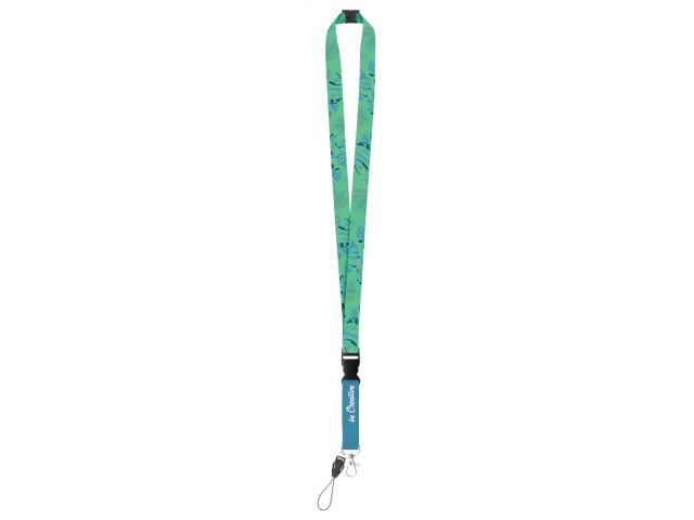 Custom made, polyester lanyard with detachable metal carabiner, mobile string and safety buckle. With sublimation printed graphics on both sides. MOQ: 100 pcs.