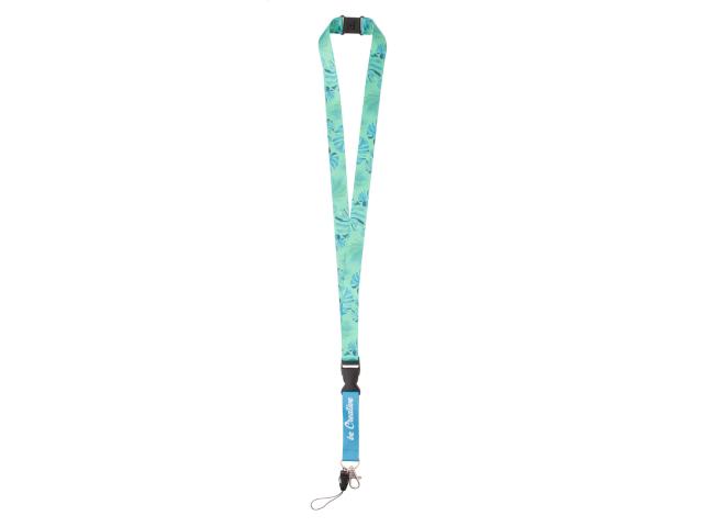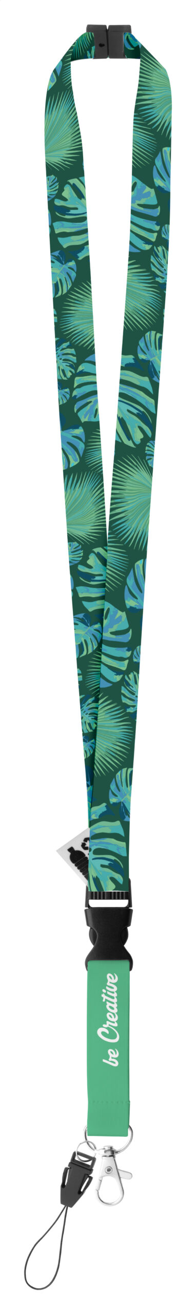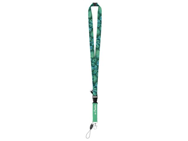 Custom made, RPET lanyard with detachable metal carabiner, mobile string and safety buckle. With sublimation printed graphics on both sides. MOQ: 100 pcs.