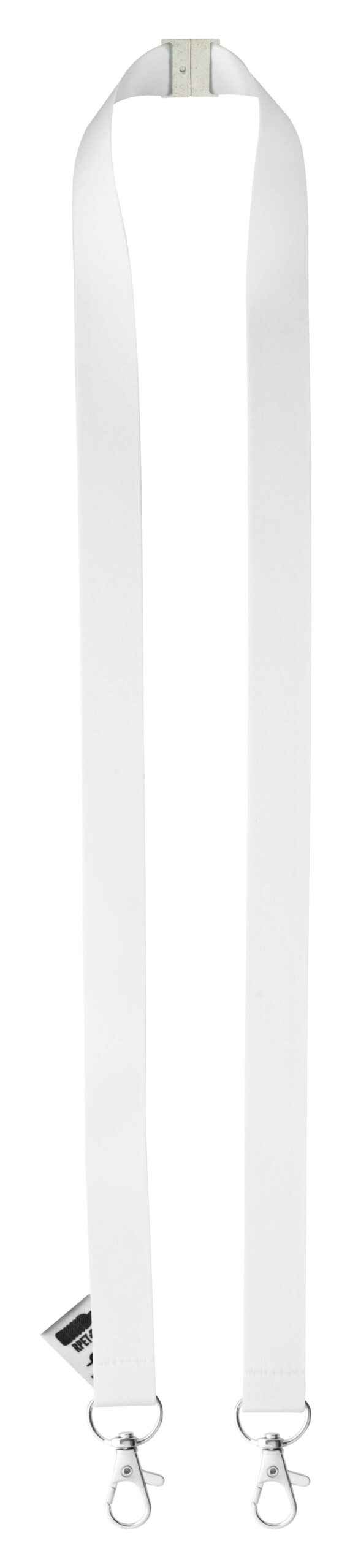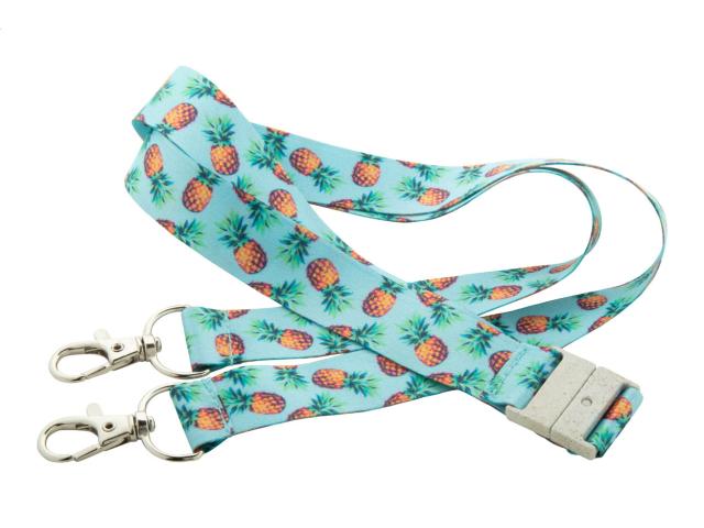 Custom made, RPET lanyard with 2 metal carabiners and wheat straw plastic safety buckle. With sublimation printed graphics on both sides. MOQ: 100 pcs.