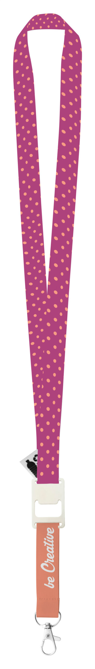 Custom made, RPET lanyard with metal carabiner and bottle opener. With sublimation printed graphics on both sides. MOQ: 100 pcs.
