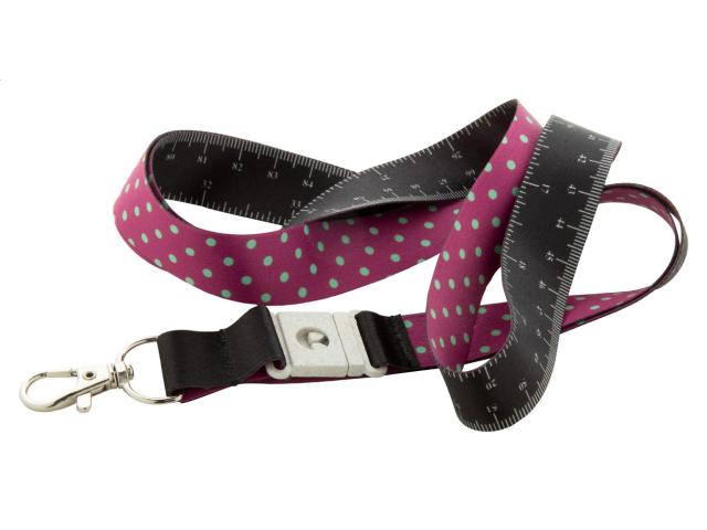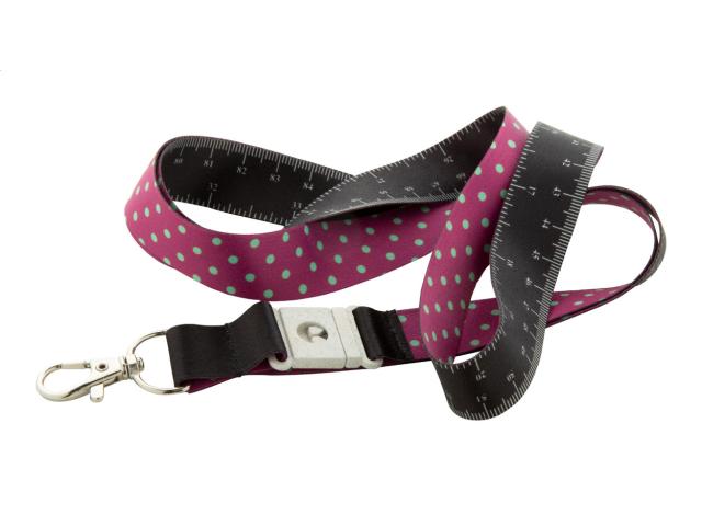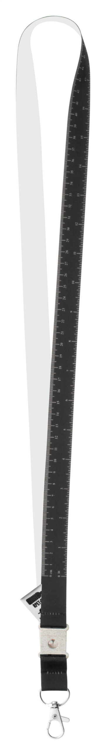 Custom made, RPET lanyard with 100 cm tape measure and metal carabiner wheat straw plastic buckle. With sublimation printed graphics on one side. MOQ: 100 pcs.
