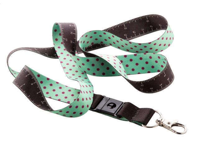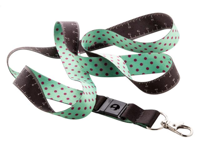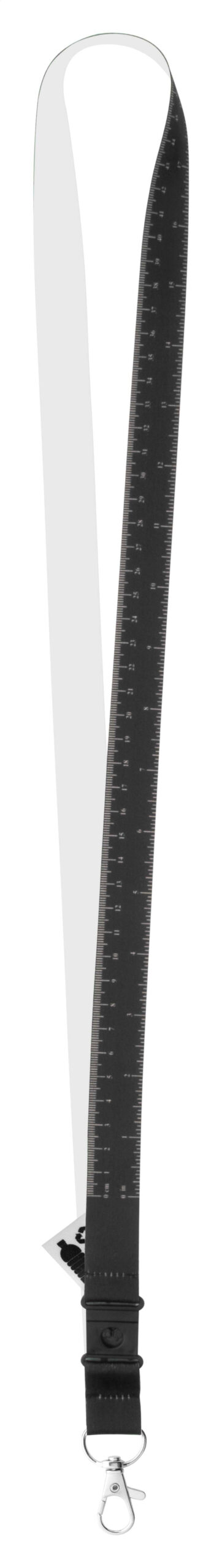 Custom made, RPET lanyard with 100 cm tape measure and metal carabiner. With sublimation printed graphics on one side. MOQ: 100 pcs.