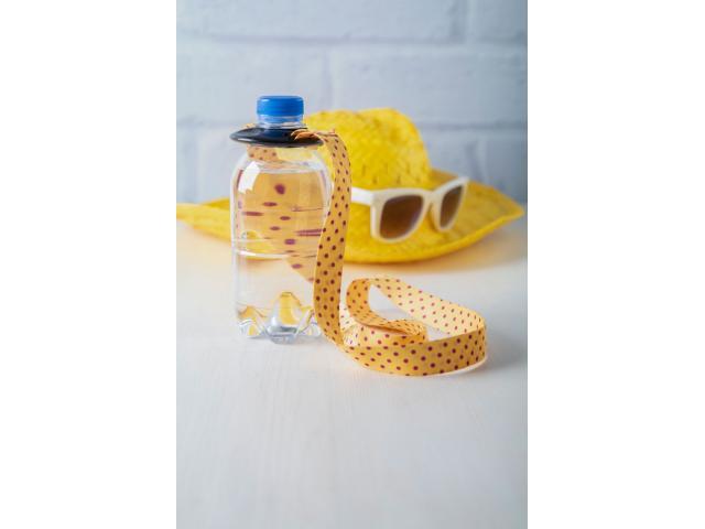 Custom made, RPET lanyard with bottle holder. With sublimation printed graphics on both sides. MOQ: 100 pcs.