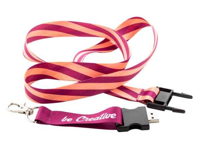 Custom made, RPET lanyard with detachable metal carabiner. With built-in 8 GB USB flash drive inside the plastic buckle. With sublimation printed graphics on both sides. MOQ: 100 pcs. USB 2.0.
