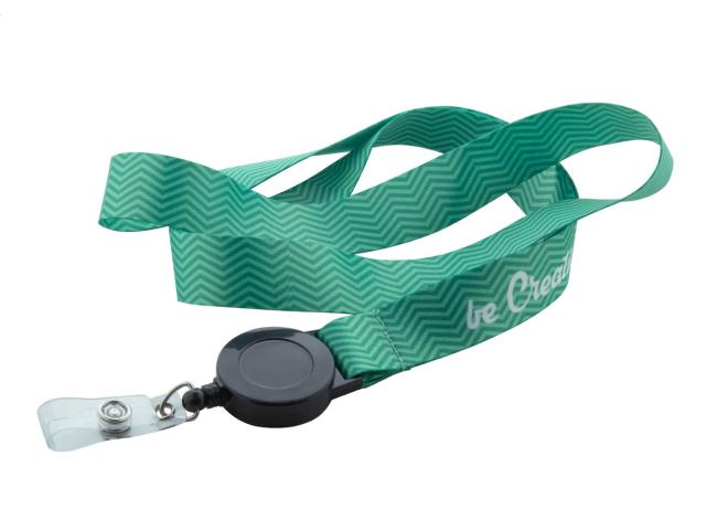 Custom made, polyester lanyard with telescopic badge holder. With sublimation printed graphics on both sides. MOQ: 100 pcs.