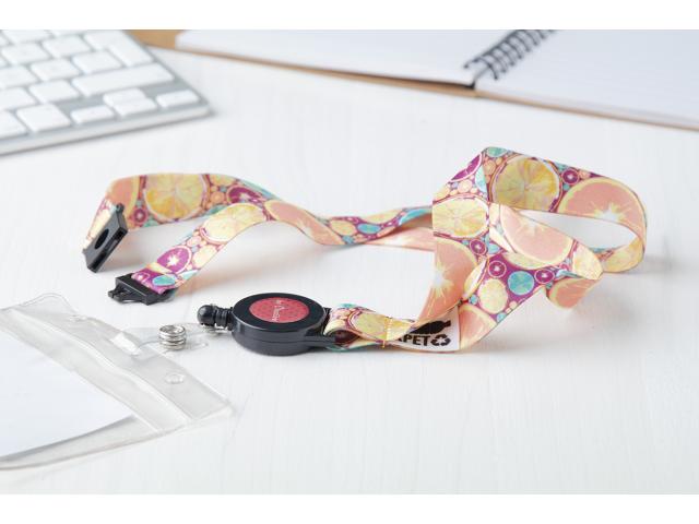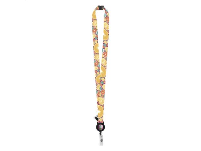 Custom made, RPET lanyard with telescopic badge holder and safety buckle. With sublimation printed graphics on both sides. MOQ: 100 pcs.