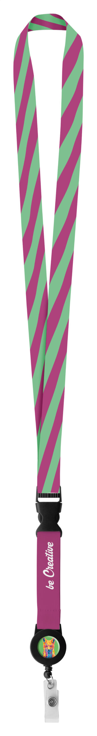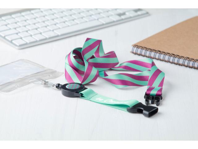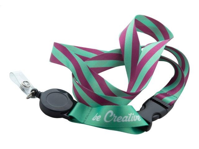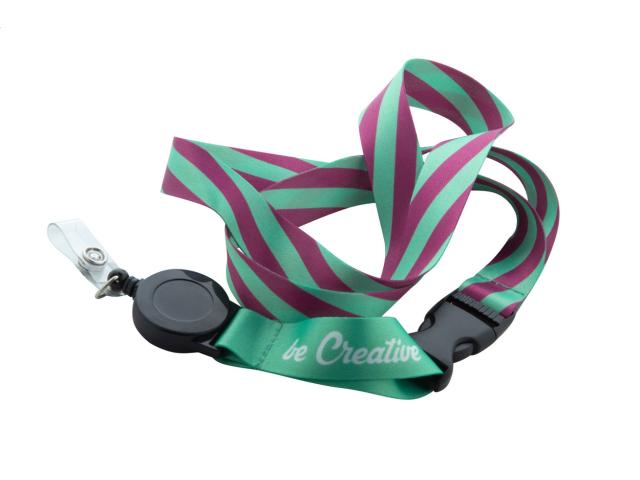 Custom made, wide polyester lanyard with detachable telescopic badge holder. With sublimation printed graphics on both sides. MOQ: 100 pcs.