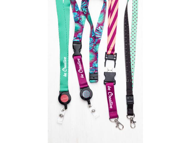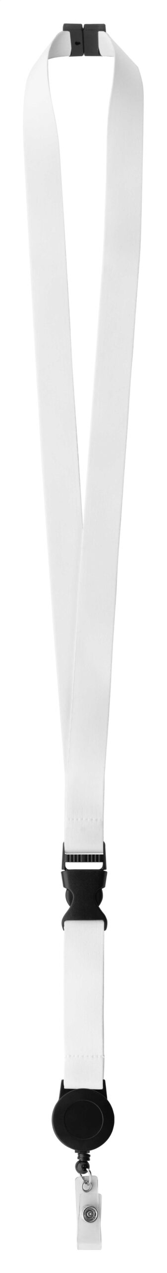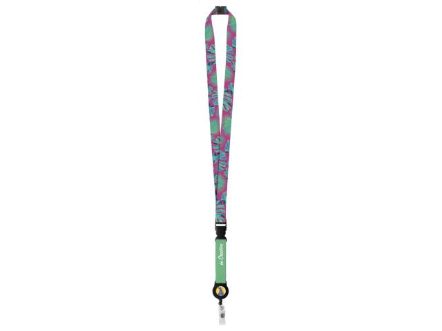 Custom made, polyester lanyard with detachable telescopic badge holder and safety buckle. With sublimation printed graphics on both sides. MOQ: 100 pcs.