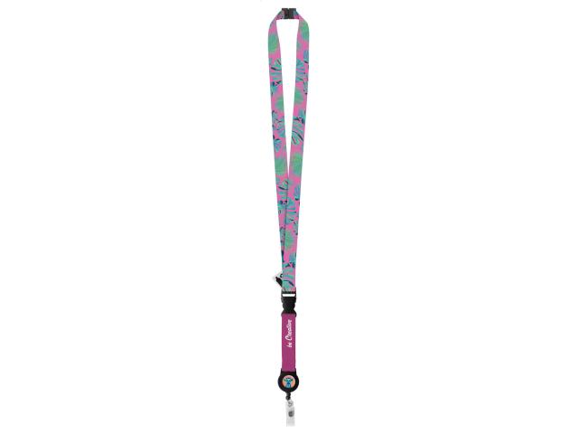 Custom made, RPET lanyard with detachable telescopic badge holder and safety buckle. With sublimation printed graphics on both sides. MOQ: 100 pcs.
