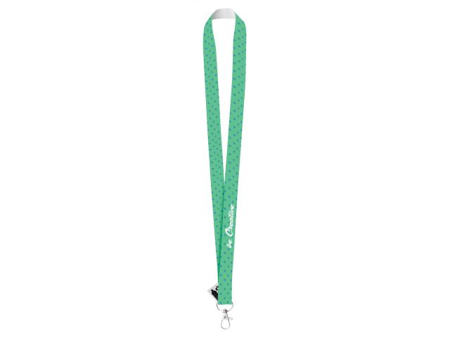 Custom made, RPET lanyard with metal carabiner. With sublimation printed graphics on one side. MOQ: xx pcs.