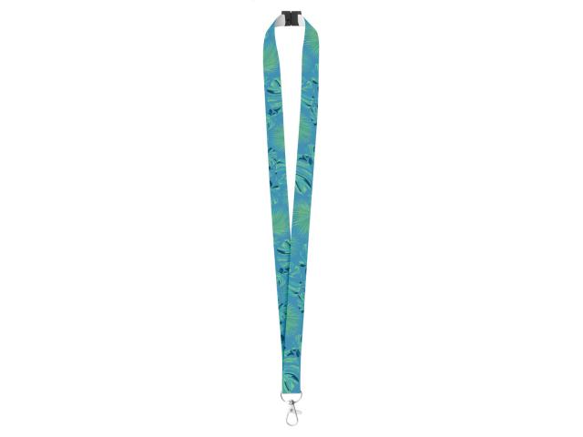 Custom made, polyester lanyard with metal carabiner and safety buckle. With sublimation printed graphics on one side. MOQ: 100 pcs.