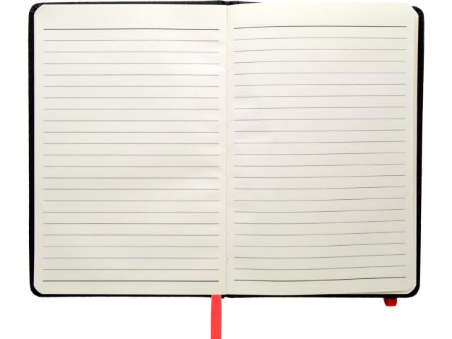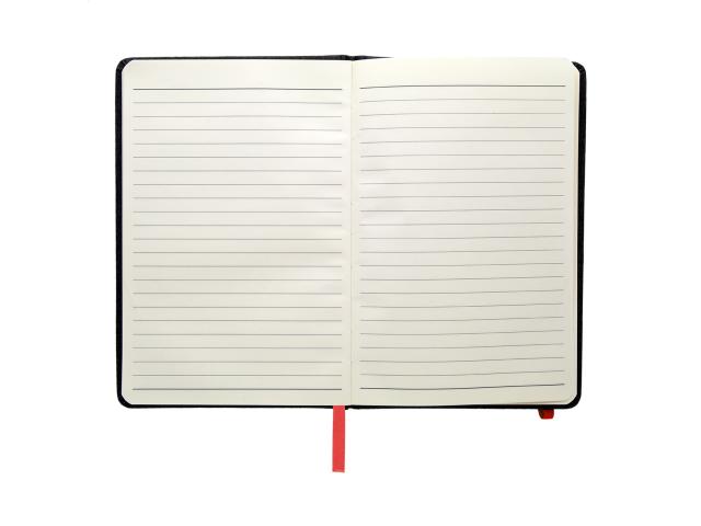 Textured PU leather covered notebook with matching bookmark, rubber band and pen holder. 96 lined sheets, A5 size.