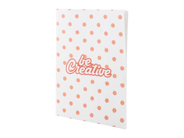 Custom made, seed paper covered notebook with 32 recycled paper sheets, A6 size. Price includes full colour printed outside cover. MOQ: 100 pcs. With assorted wildflower seeds.
