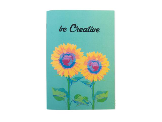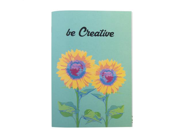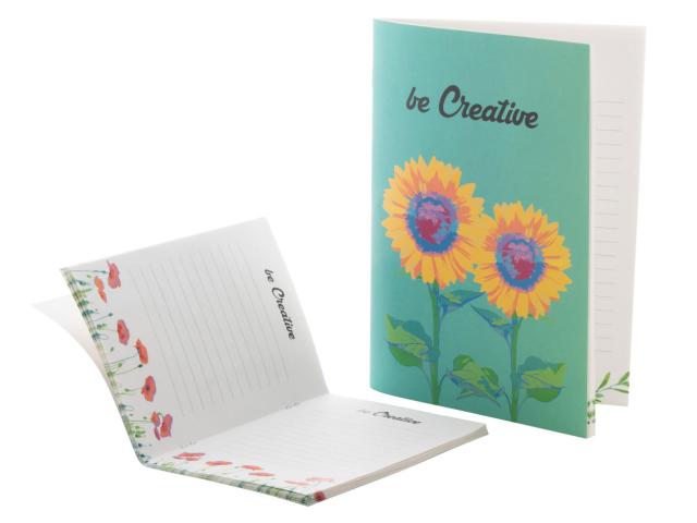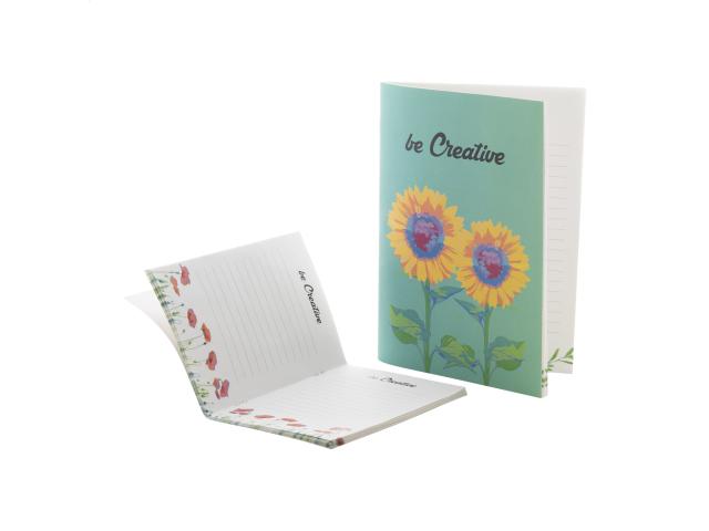 Custom made, recycled paper covered notebook with 32 recycled paper sheets, A5 size. Price includes full colour printed outside cover and an identical full colour print on all inside pages. MOQ: 100 pcs.