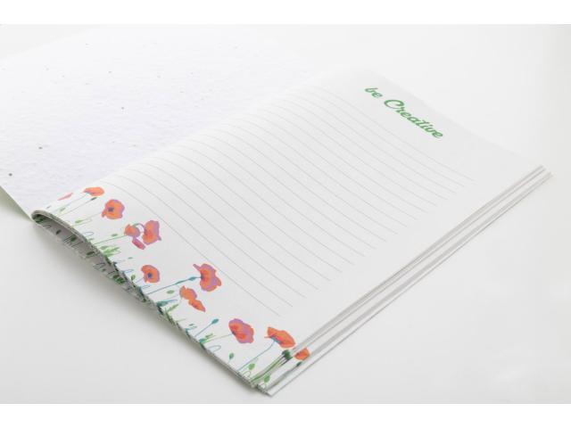 Custom made, seed paper covered notebook with 32 recycled paper sheets, A5 size. Price includes full colour printed outside cover and an identical full colour print on all inside pages. MOQ: 100 pcs. With assorted wildflower seeds.
