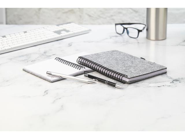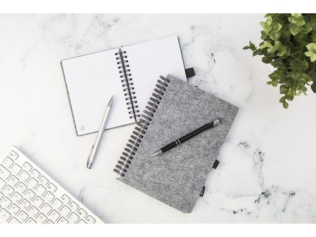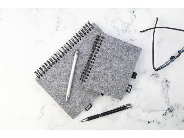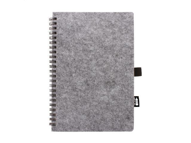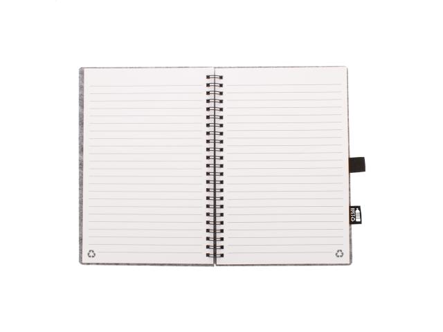 RPET felt covered spiral notebook with distinctive RPET label and 80 lined sheets in recycled paper. A5 size.