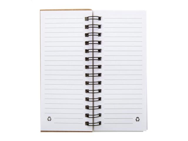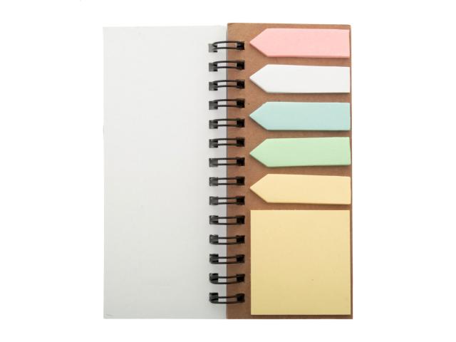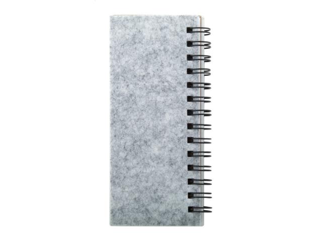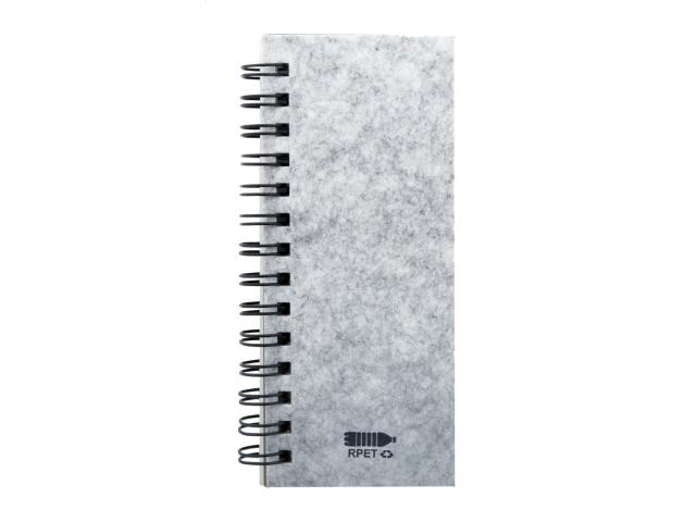 RPET felt covered spiral notebook with 40 lined sheets in recycled paper, 25 sticky notes and 125 page markers (in 5 different colours).