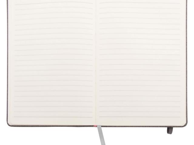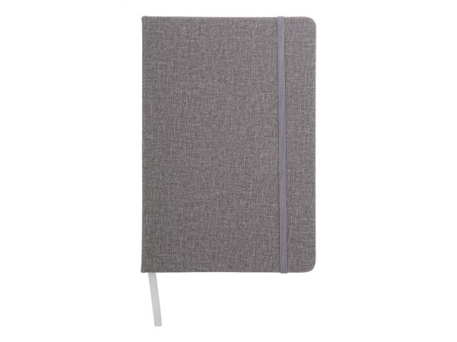 Textured PU leather covered notebook with rubber strap and 80 lined sheets. A5 size.