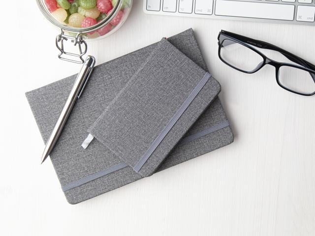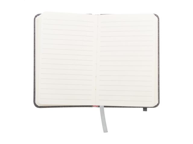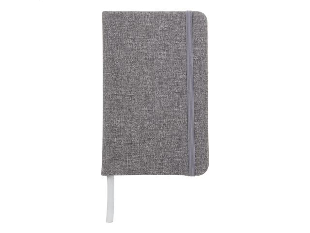 Textured PU leather covered notebook with rubber strap and 80 lined sheets. A6 size.