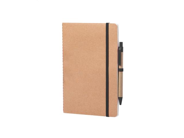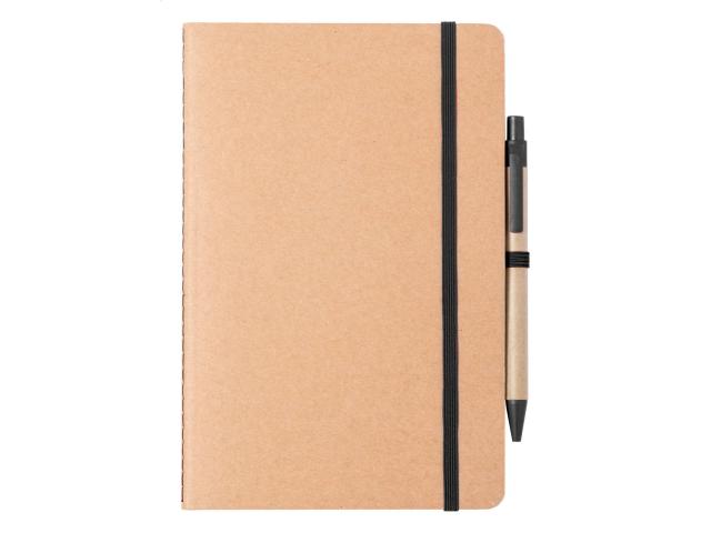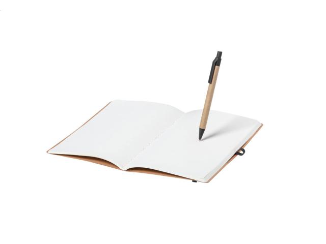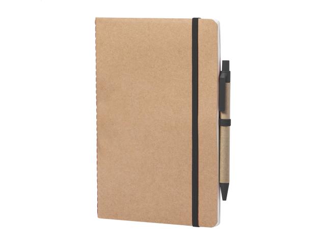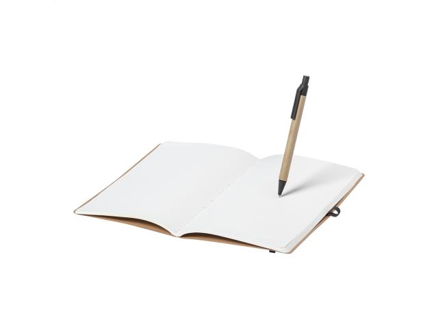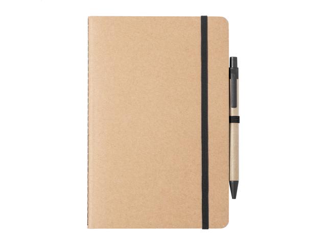 Recycled cardboard covered notebook with 60 blank sheets and coloured rubber strap, A5 size. Including wheat straw plastic ballpoint pen with blue refill.