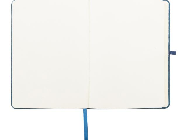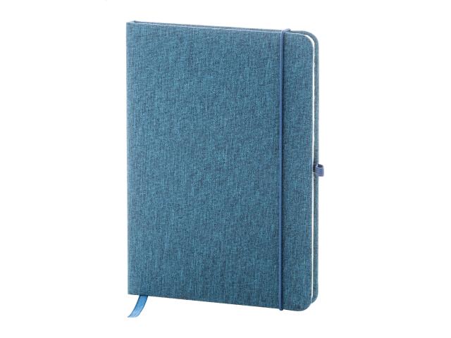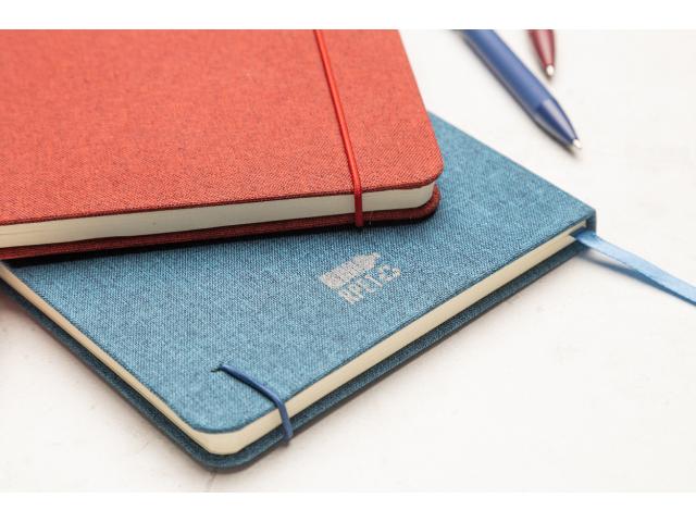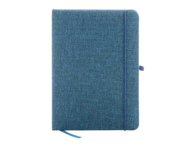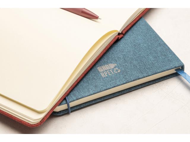 300D RPET polyester covered notebook with 80 blank sheets. With maching colour rubber strap, bookmark and pen holder. A5 size.