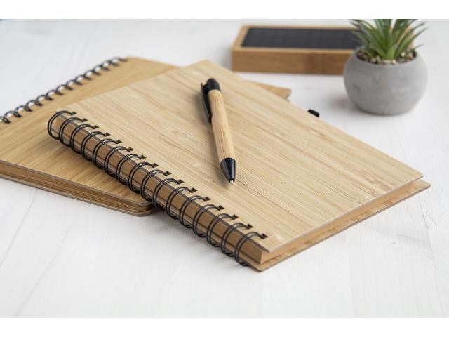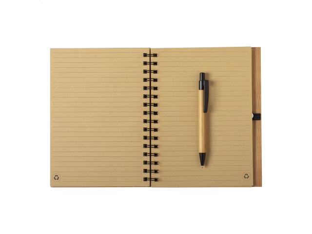 Bamboo covered spiral notebook. Including bamboo ballpoint pen with black refill. 80 lined sheets, A5 size.