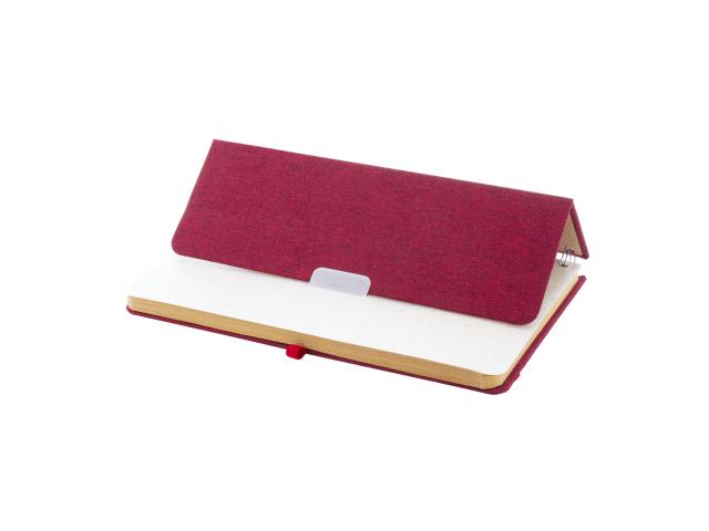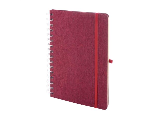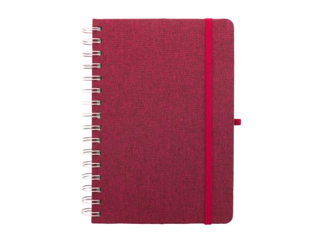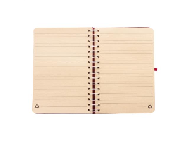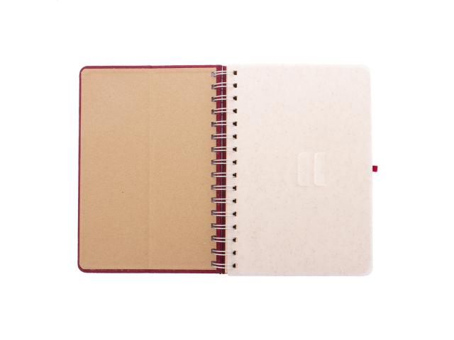 RPET polyester covered spiral notebook with wheat straw plastic mobile and tablet holder insert. With 70 lined sheets in recycled kraft paper, rubber strap and pen holder. A5 size.