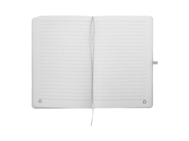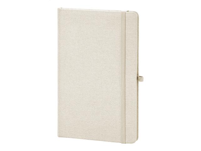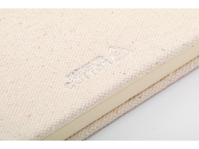 Recycled cotton covered notebook with 80 lined sheets in recycled paper. With matching colour bookmark, rubber band and pen holder. A5 size.