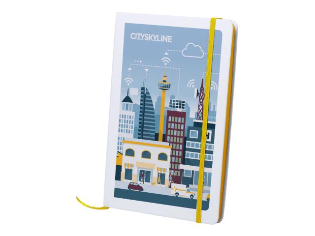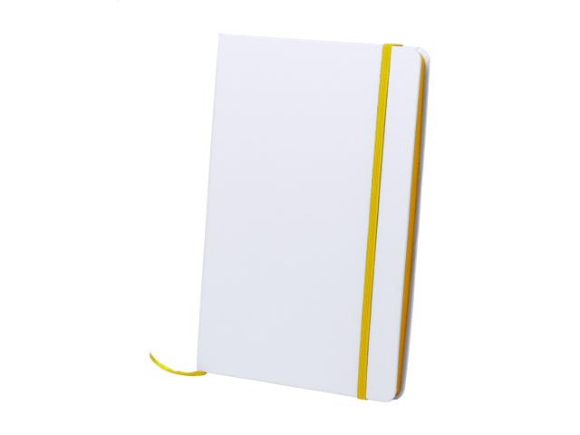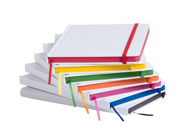 Paper covered notebook with 100 blank sheets and coloured rubber strap and matching colour side, A5.