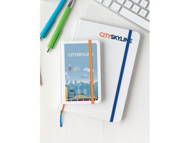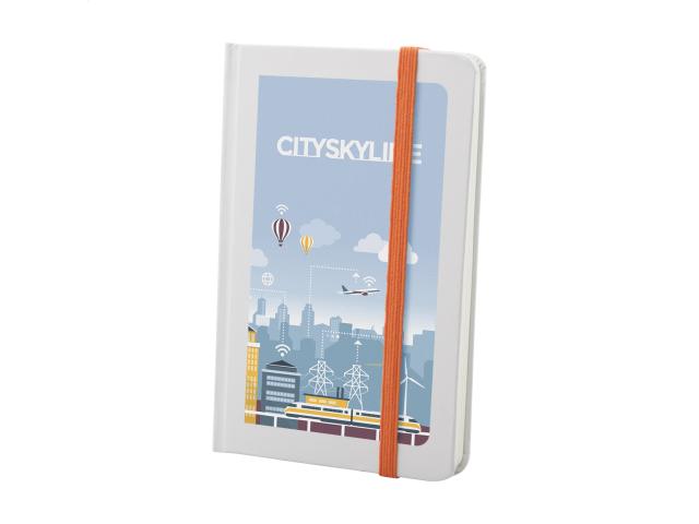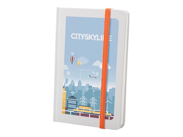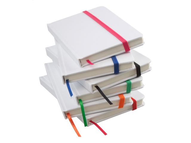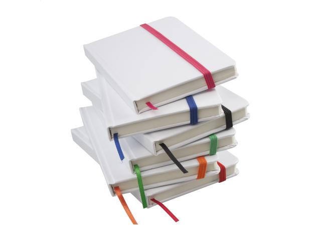 White carton covered notebook with 80 blank sheets and coloured rubber strap. A6 size.
