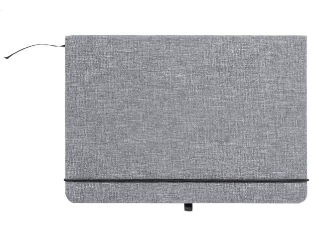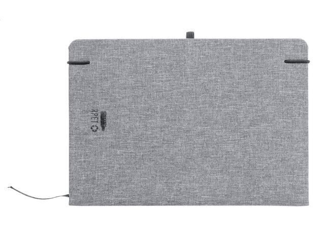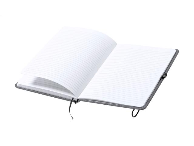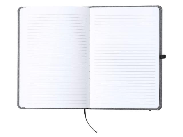 600D RPET polyester covered notebook with 100 lined sheets, bookmark and rubber strap. A5 size.