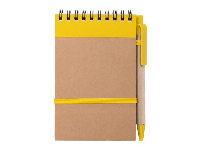 Recycled paper, spiral notebook with 70 lined sheets. With recycled paper ballpoint pen, with blue refill. A6 size.