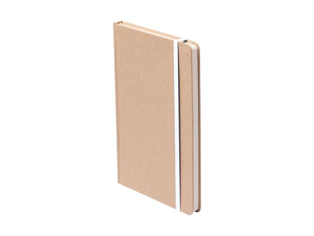 Recycled cardboard covered notebook with 100 blank sheets, coloured bookmark and rubber strap.