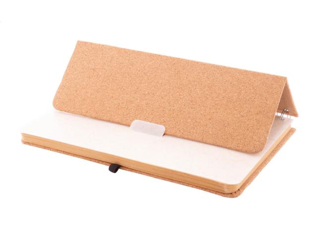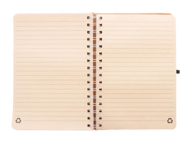 Natural cork covered spiral notebook with wheat straw plastic mobile and tablet holder insert. With 70 lined sheets in recycled kraft paper, rubber strap and pen holder. A5 size.