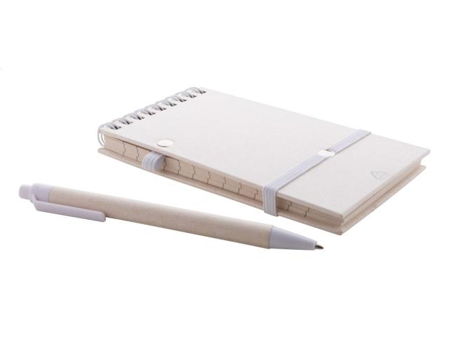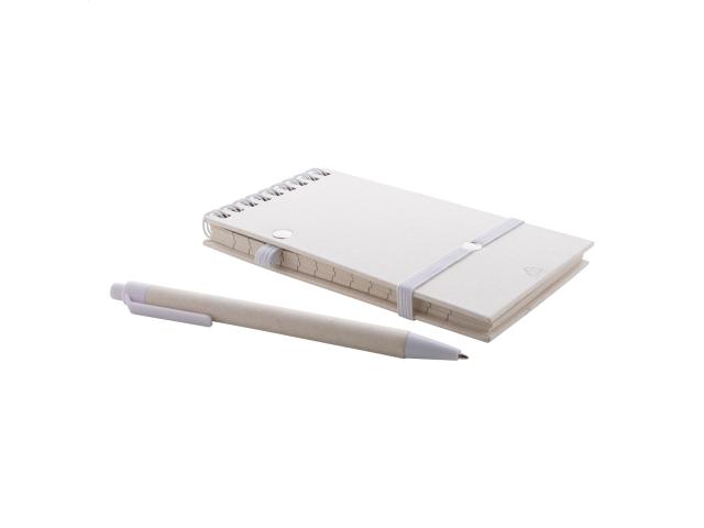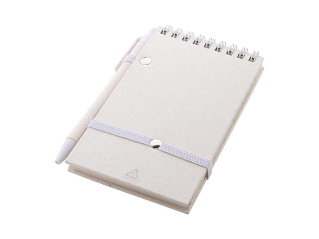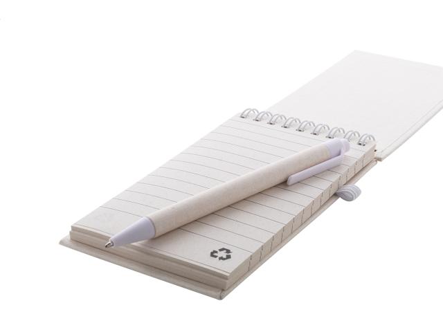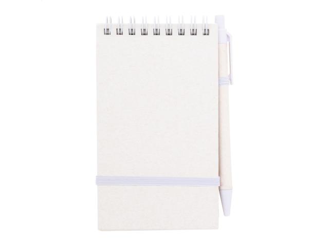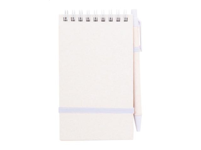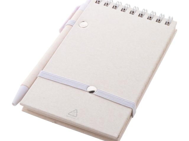 Recycled milk carton paper spiral notebook with hard cover and 70 lined sheets. With matching colour spiral rings, rubber strap and pen holder. Including recycled milk carton paper and recycled ABS plastic ballpoint pen with blue refill. A6 size.