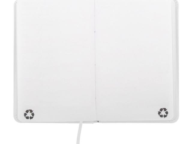 Recycled PU leather covered notebook with 100 blank sheets in recycled paper. With matching colour bookmark and rubber band. A6 size.