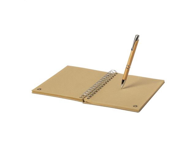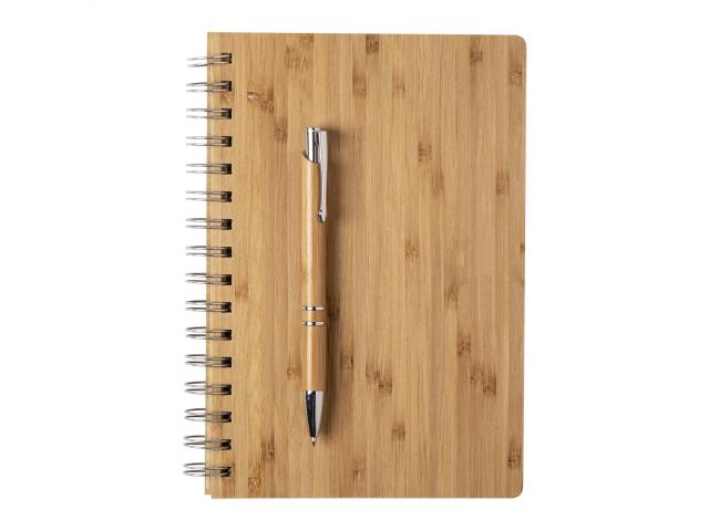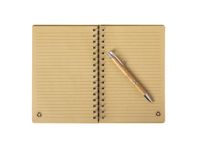 Bamboo covered spiral notebook. Including bamboo ballpoint pen with black refill. 80 lined sheets, A5 size. In kraft paper box.