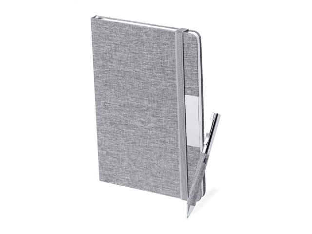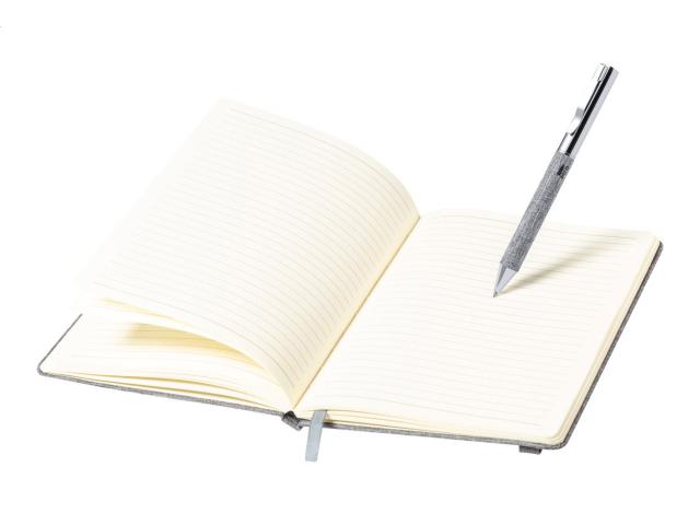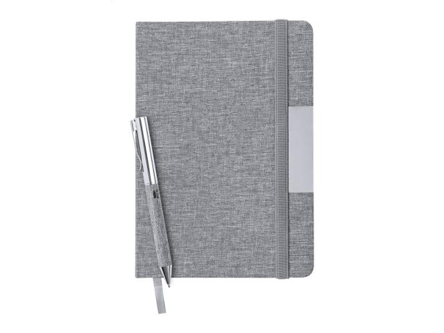 300D RPET polyester covered notebook with 100 lined sheets and rubber strap. Including an RPET polyester covered metal ballpoint pen, with blue refill. A5 size.