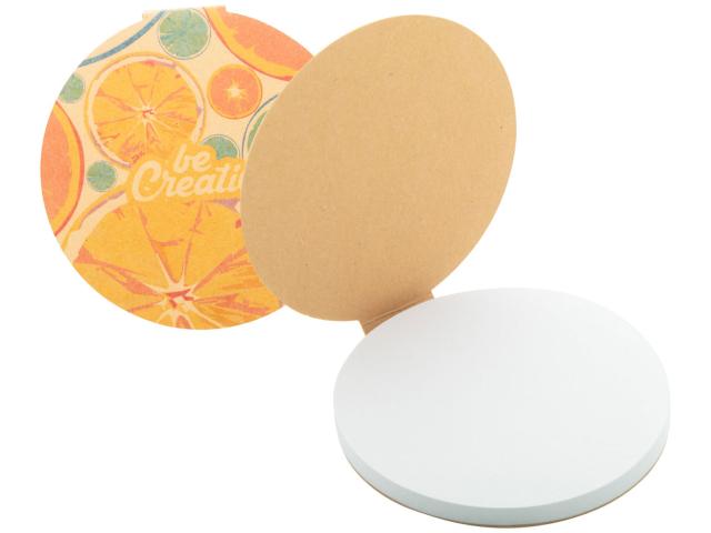 Custom made, recycled kraft paper covered round shaped sticky notepad. Includes 50 sheets of recycled paper sticky notes. Price includes full colour printed outside cover. MOQ: 100 pcs.
