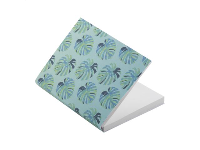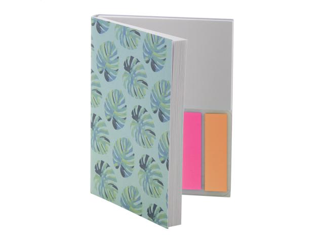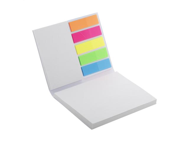Custom made, paper covered sticky notepad. Includes recycled paper sticky notes in 2 sizes (50 sheets of 100×75 mm, 25 sheets of 50×75 mm) and 100 plastic film page markers in 5 assorted colours (12×44 mm). Price includes full colour printed outside cover. MOQ: 100 pcs.