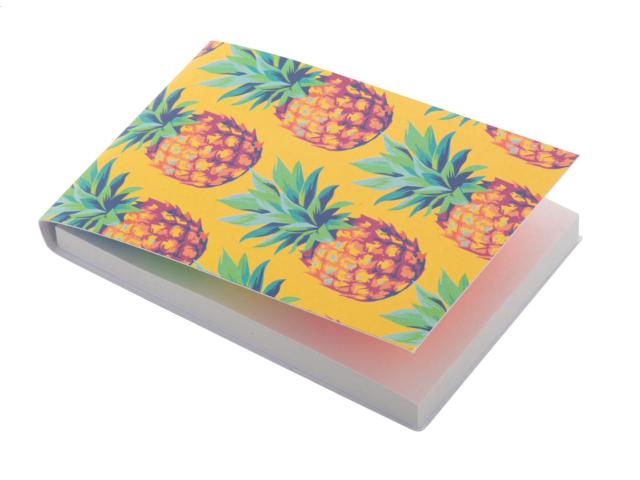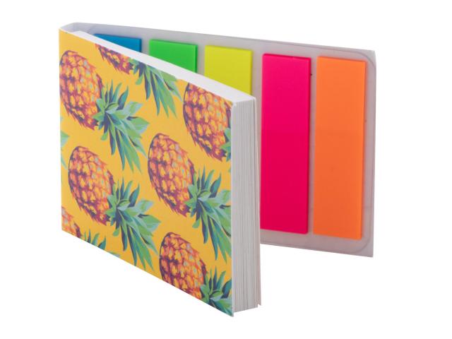 Custom made, paper covered sticky notepad. Includes 50 sheets of recycled paper sticky notes (50×75 mm) and 100 plastic film page markers in 5 assorted colours (44×12 mm). Price includes full colour printed outside cover. MOQ: 100 pcs.
