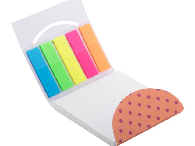 Custom made, paper covered sticky notepad. Includes 50 sheets of recycled paper sticky notes (75×75 mm) and 100 plastic film page markers in 5 assorted colours (44×12 mm). Price includes full colour printed outside cover. MOQ: 100 pcs.