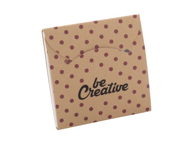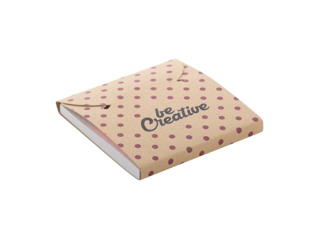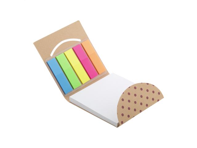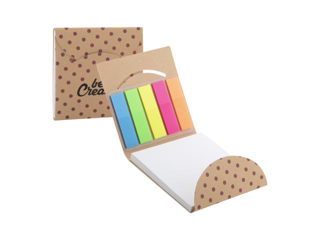 Custom made, recycled kraft paper covered sticky notepad. Includes 50 sheets of recycled paper sticky notes (75×75 mm) and 100 plastic film page markers in 5 assorted colours (44×12 mm). Price includes full colour printed outside cover. MOQ: 100 pcs.