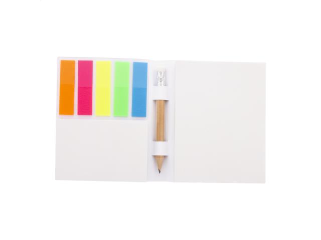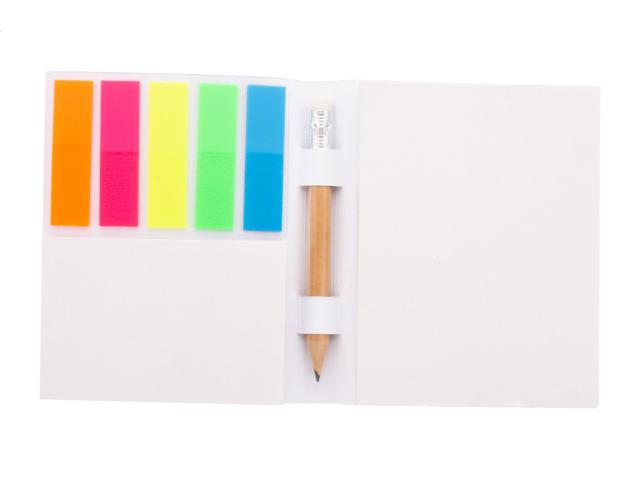 Custom made, paper covered sticky notepad with mini wooden pencil. Includes recycled paper sticky notes in 2 sizes (50 sheets of 100×75 mm, 25 sheets of 50×75 mm) and 100 plastic film page markers in 5 assorted colours (12×44 mm). Price includes full colour printed outside cover. MOQ: 100 pcs.